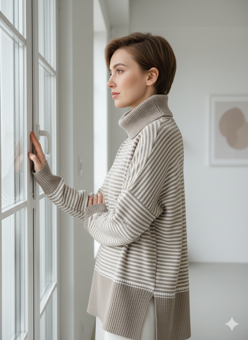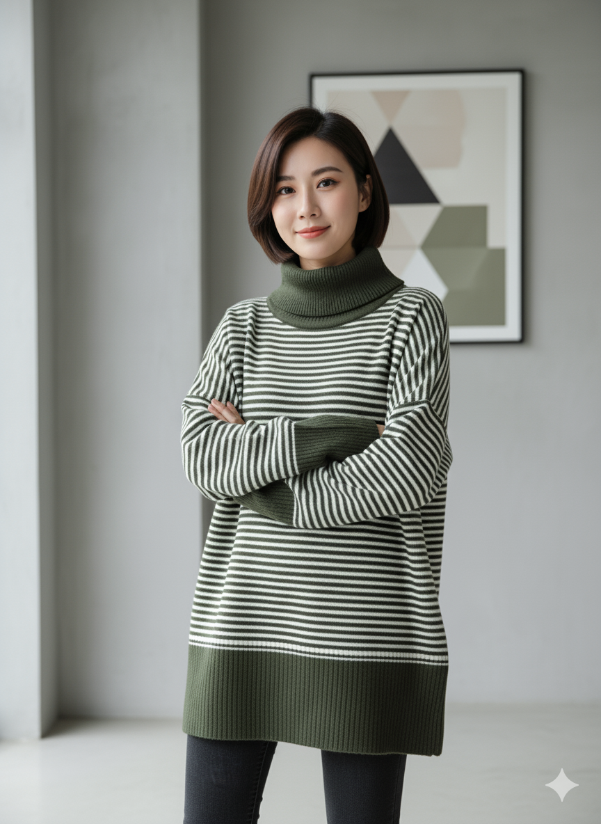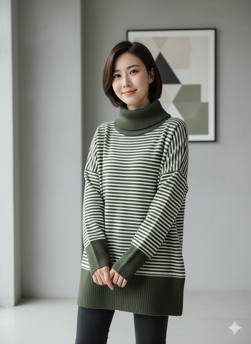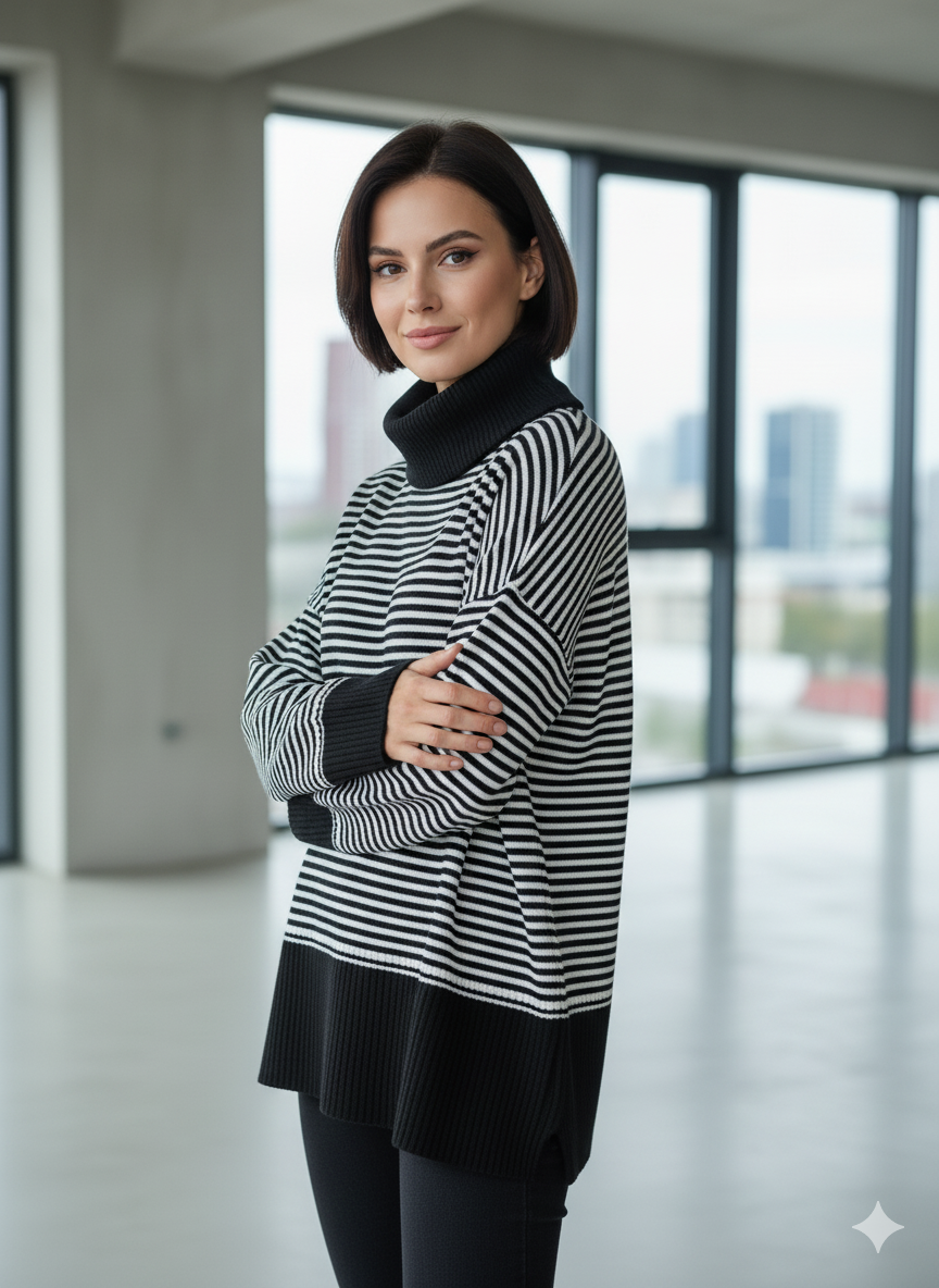 پلیور بافت زنانه مدل یقه اسکی طرح راه راه کد ۳۰۷۷