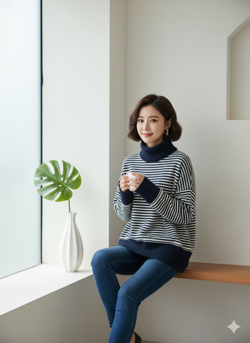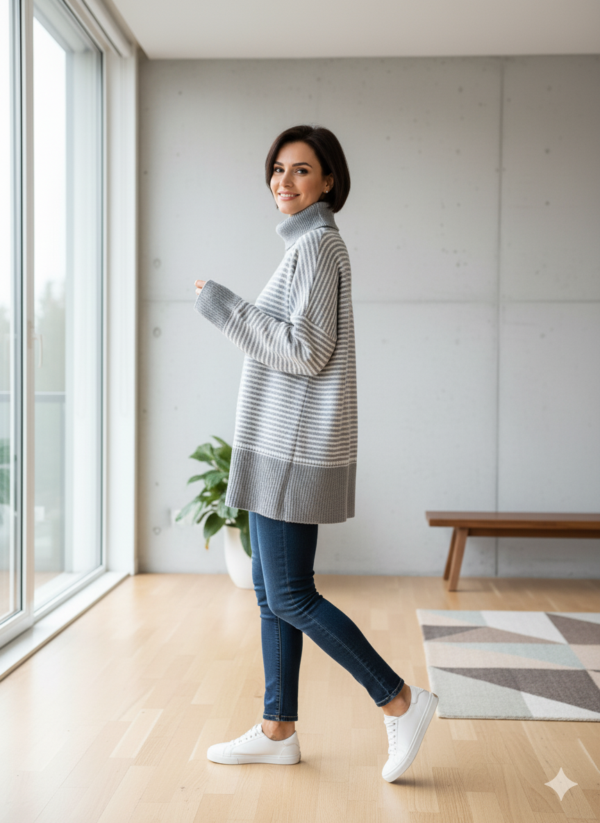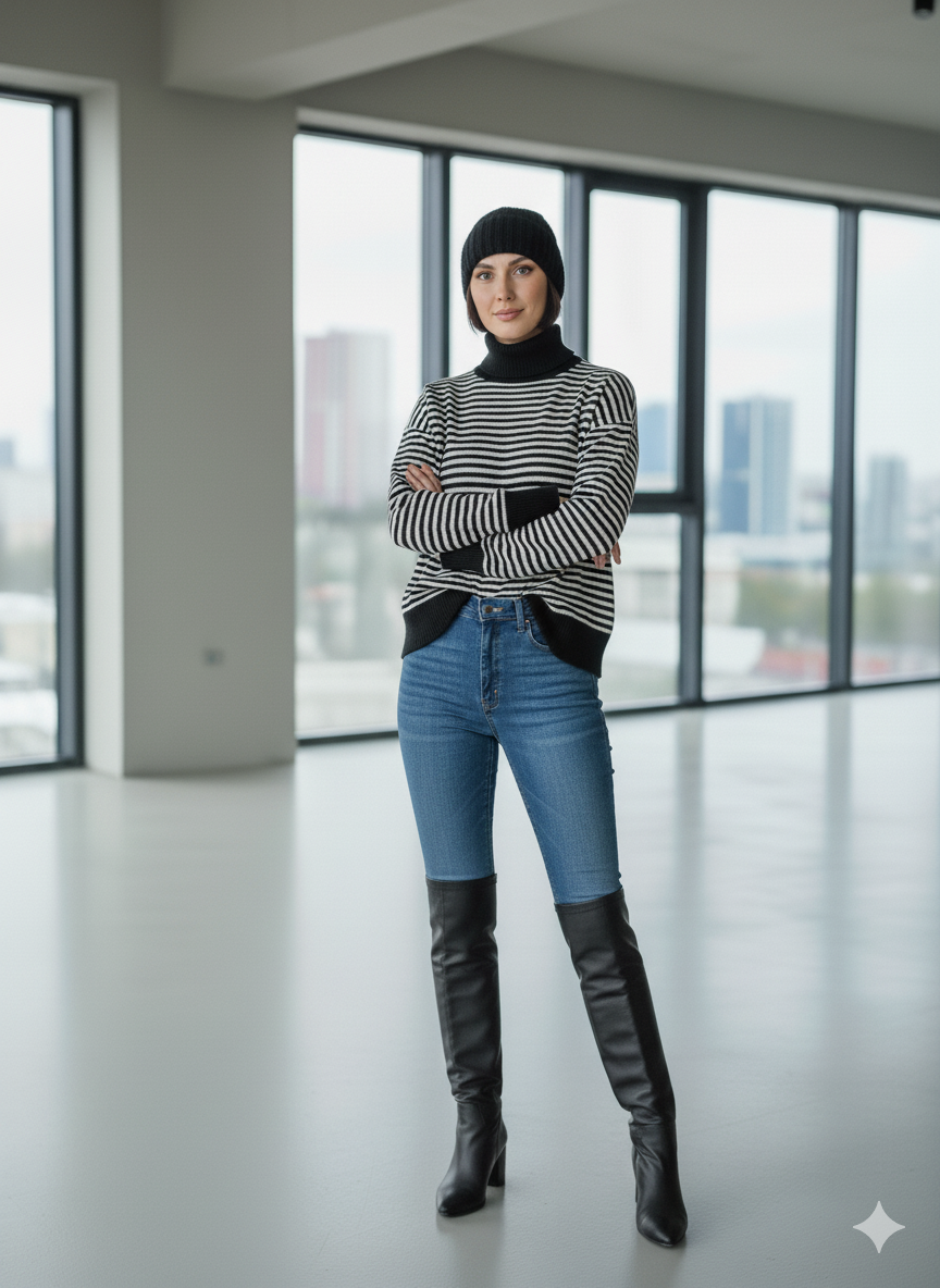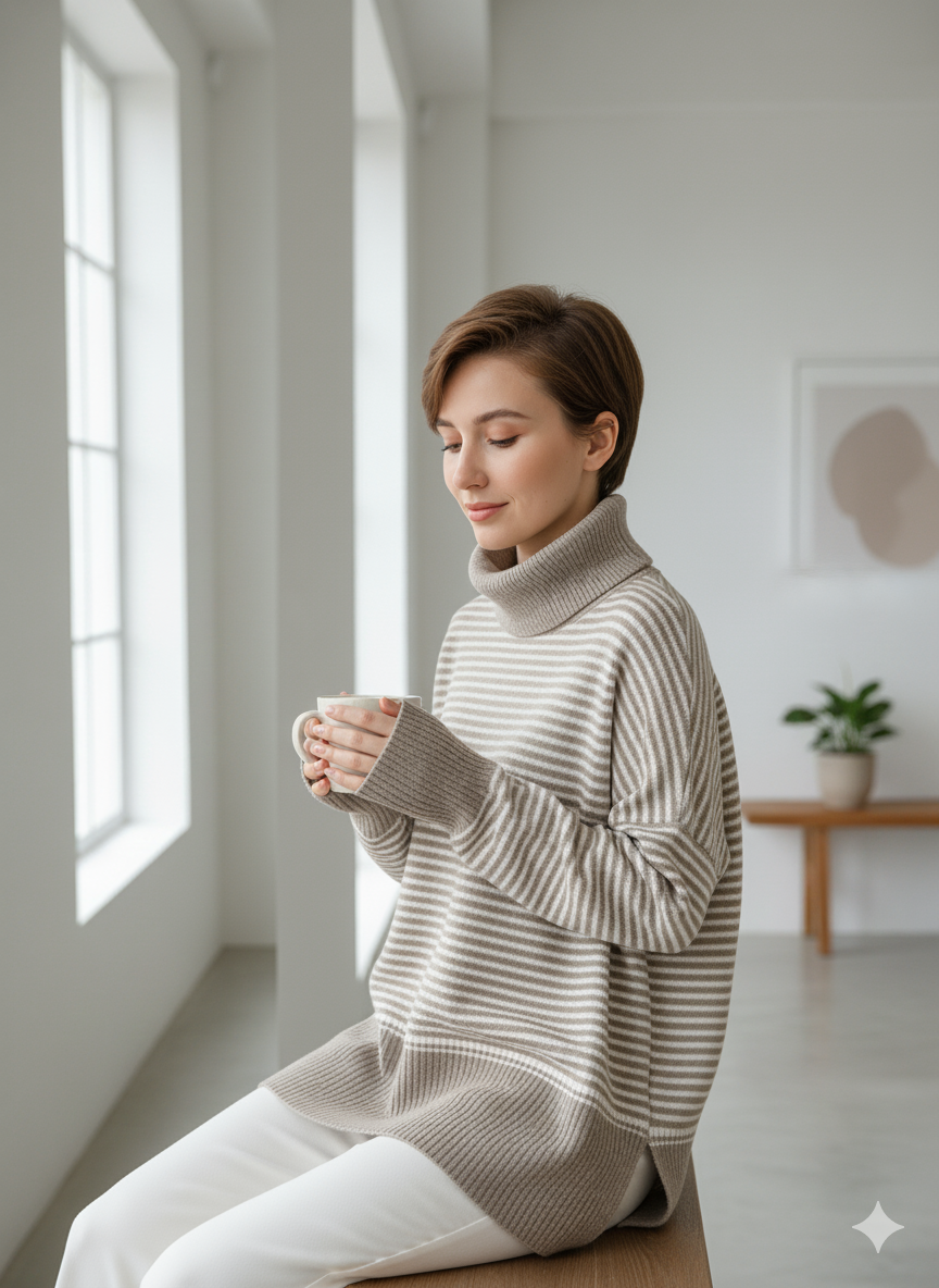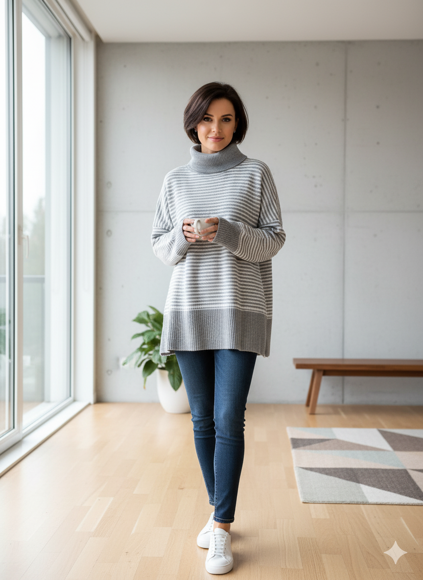 پلیور بافت زنانه مدل یقه اسکی طرح راه راه کد ۳۰۷۷