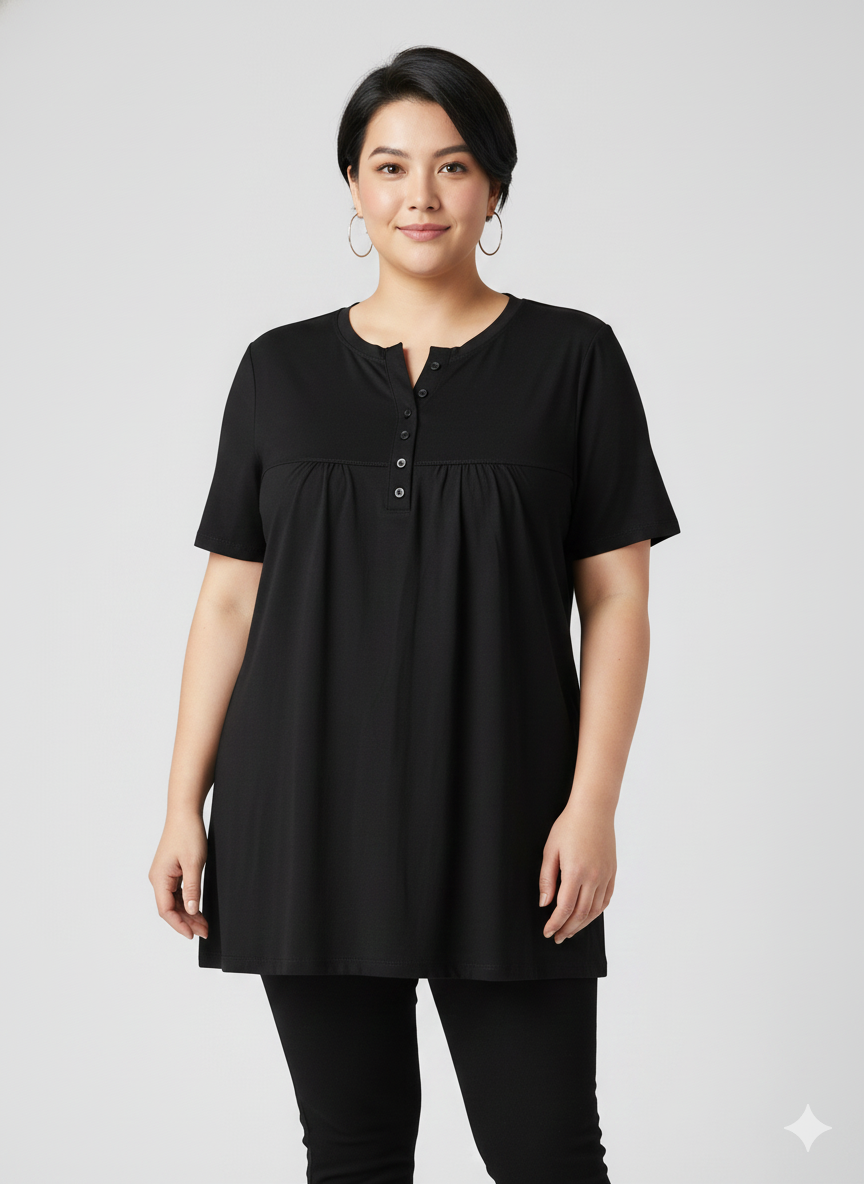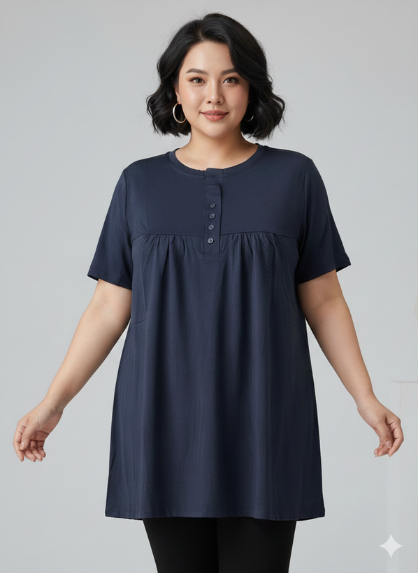 مدل: تیشرت چین دار دکمه دار جنس:ویسکوز💯تیپ عالی دووَر کِش قد تیشرت:75 سایز:فری سایز (مناسب سایز 44تا54)