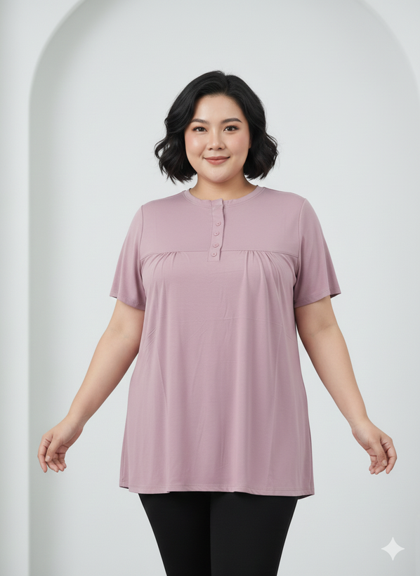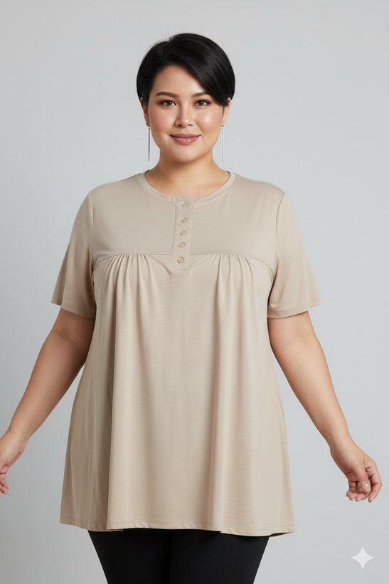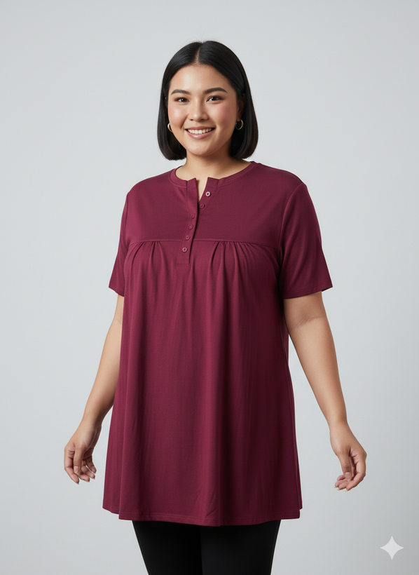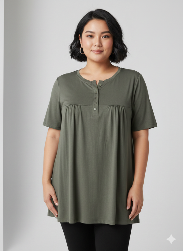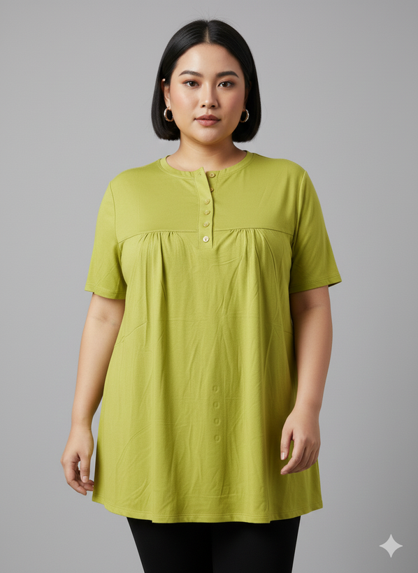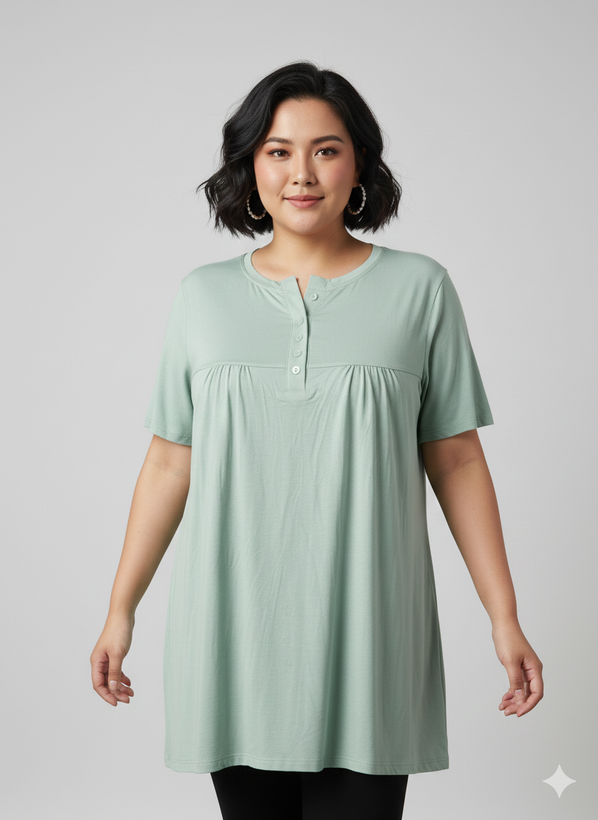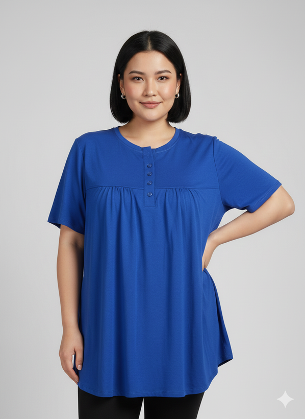 مدل: تیشرت چین دار دکمه دار جنس:ویسکوز💯تیپ عالی دووَر کِش قد تیشرت:75 سایز:فری سایز (مناسب سایز 44تا54)