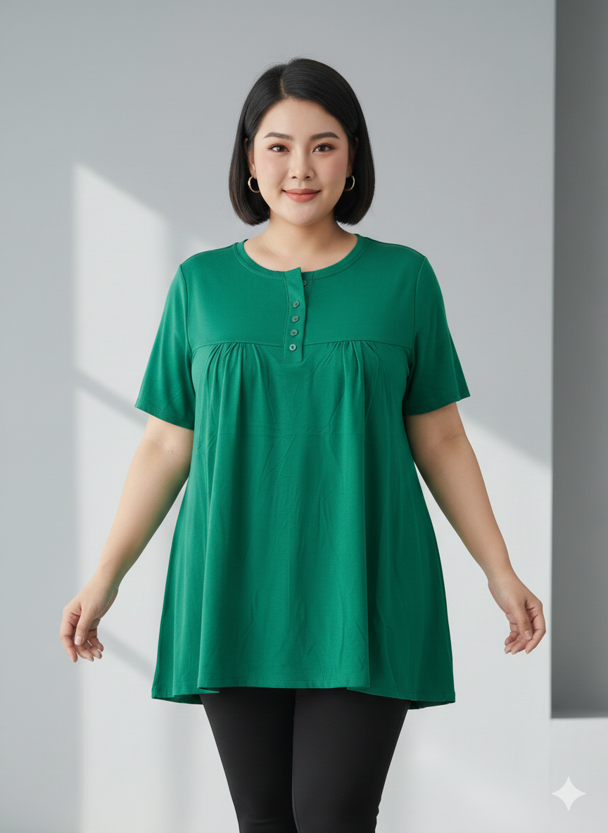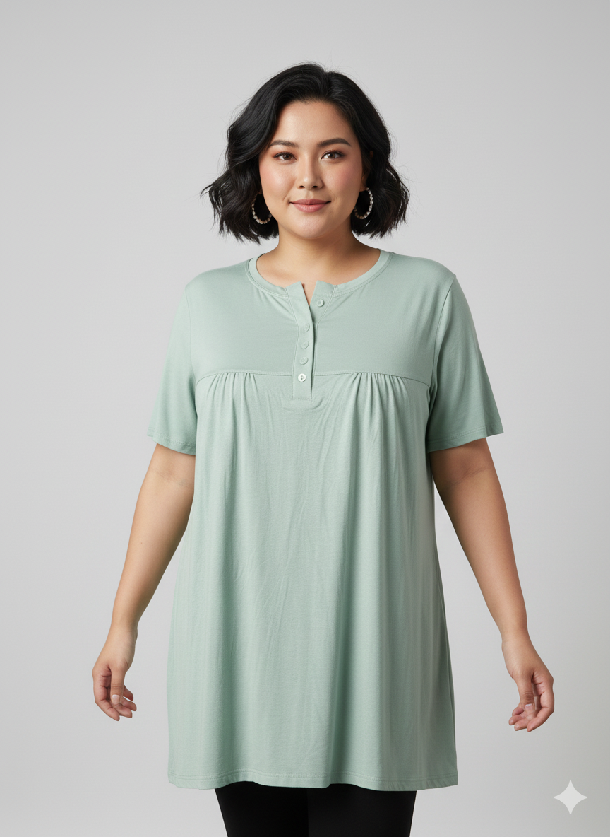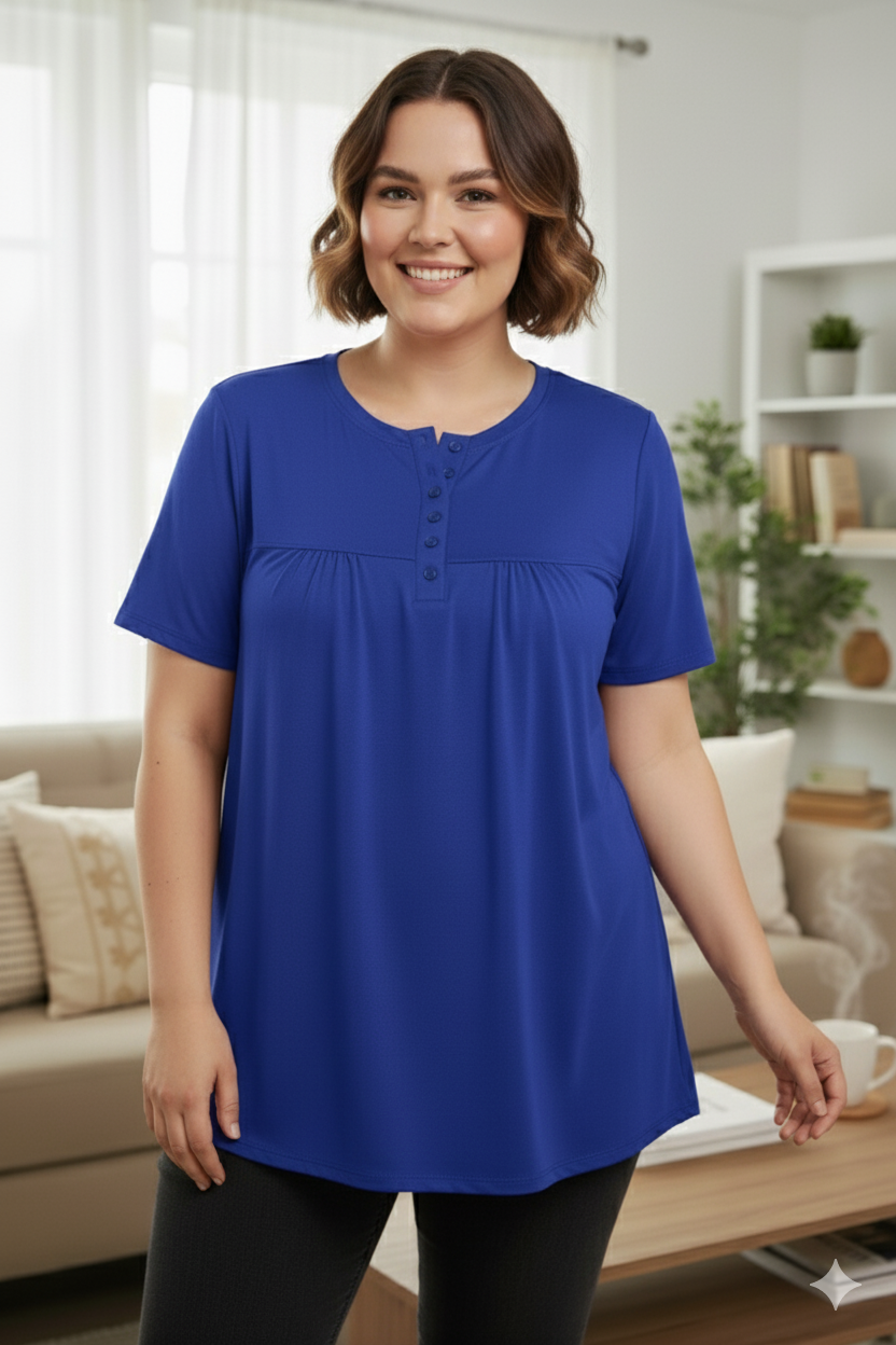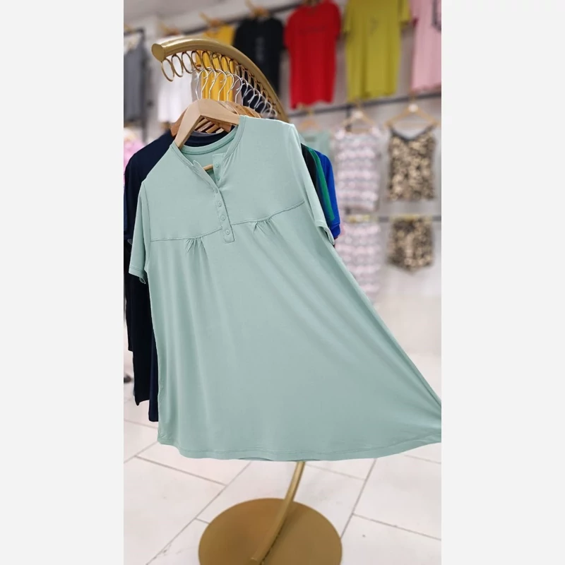 مدل: تیشرت چین دار دکمه دار جنس:ویسکوز💯تیپ عالی دووَر کِش قد تیشرت:75 سایز:فری سایز (مناسب سایز 44تا54)